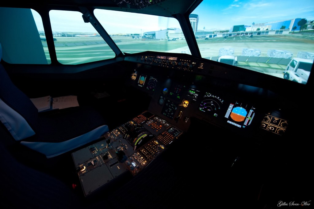 A quelques nautiques du dernier virage avant alignement sur la piste, alors que l’orage se fait de plus en plus violent autour de nous, Dimitri simule une perte de génératrice avec une panne de l’affichage principal. Bien au chaud dans notre simulateur lyonnais, j’effectue tranquillement les quelques manipulations permettant de relancer les moteurs tout en contrôlant l’appareil avec les instruments de secours. Cela dure sans doute moins d’une minute ; les systèmes d’urgence et le calme de Dimitri ne me laissent même pas l’occasion de stresser. Bien au contraire: rien ne semble pouvoir empêcher cet avion d’arriver à bon port… ni la foudre, ni le vent, pas même ma maladresse.