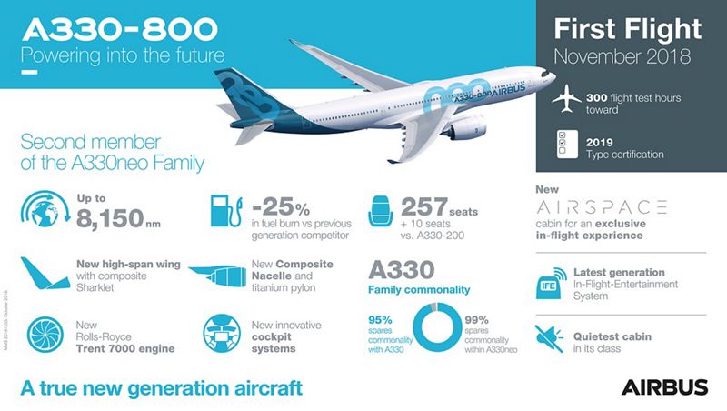 Le programme de développement et d’essais de l’A330-800neo comprendra quelques 300 heures en vue de l’obtention de la certification en 2019.